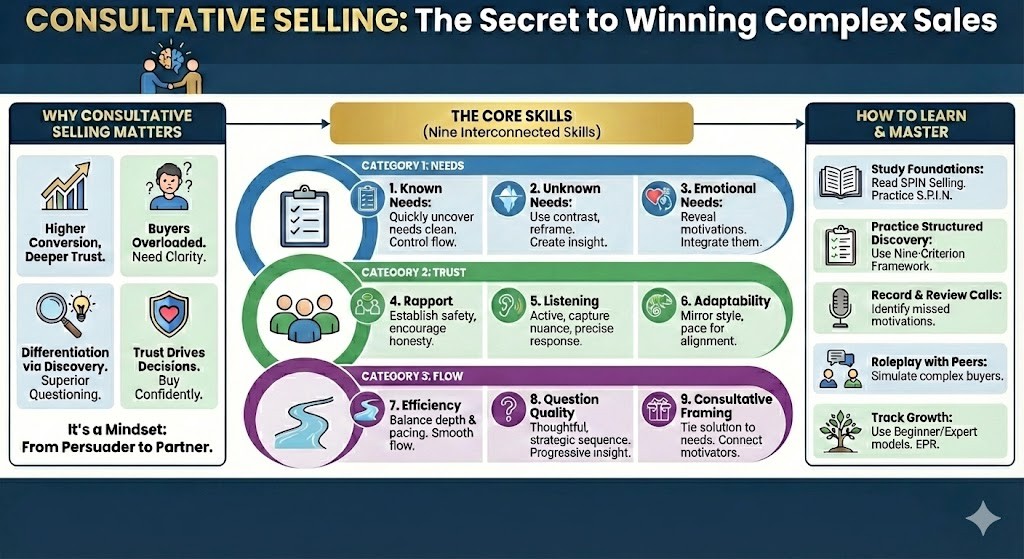 Consultative selling is the craft of understanding people, not just promoting products. The best sellers diagnose before prescribing, listen before speaking, and reveal before pitching. They create conversations that lead to clarity, confidence, and trust.